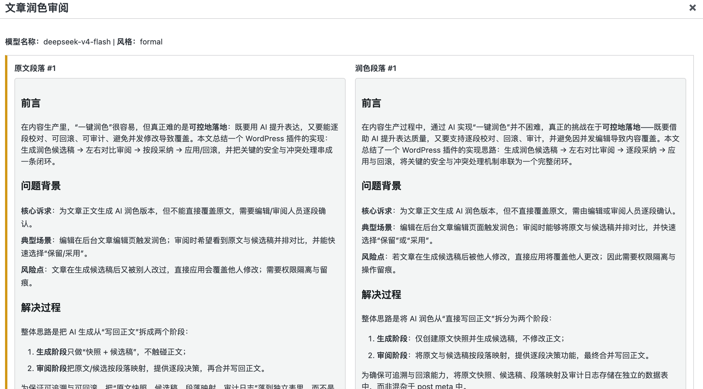 - 典型场景:编辑在后台文章编辑页触发润色;审阅时希望看到原文与候选稿并排对比,并能快速选择“保留/采用”。