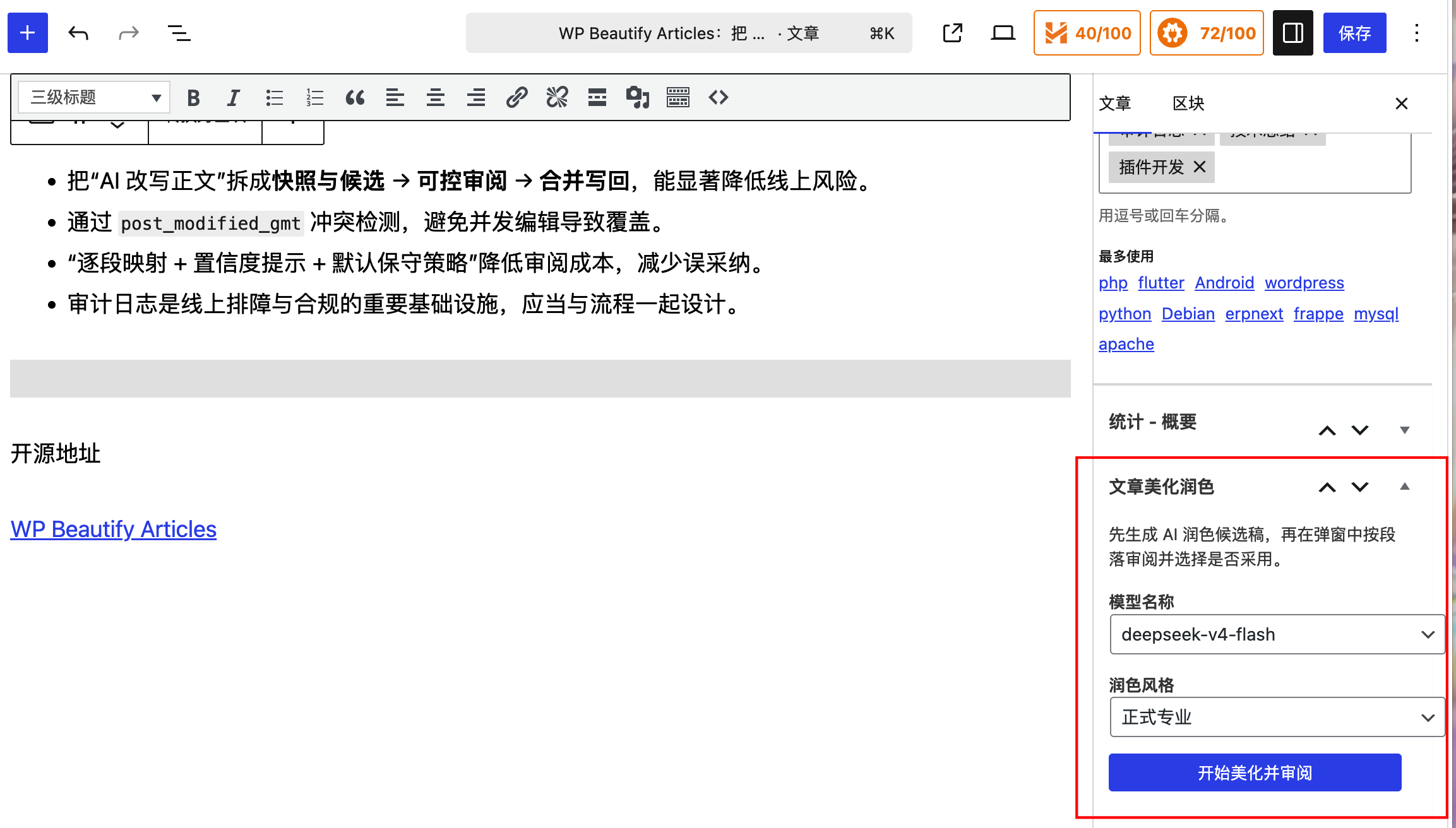 WP Beautify Articles:把 AI 润色引入 WordPress 的逐段审阅工作流