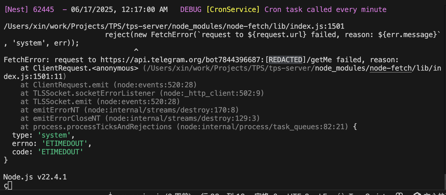小鑫 2025年6月17日 · JavaScript [nestjs/telegraf] polling fetchError: ETIMEDOUT 导致 bot 被停止的问题 当 polling 访问 telegram api 超时的时候,就会出现这个问题(node v22.4.1) …